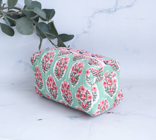 Block Printed Floral Quilted Cotton Makeup Bag - medium