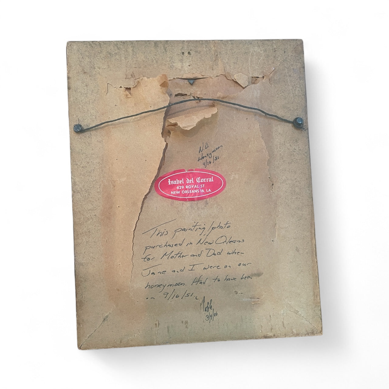 This small oil painting captures the charm of a classic New Orleans courtyard—complete with a red staircase railing, tropical plants, and French Quarter architecture. A lovely example of mid-20th century Louisiana regional art, it reflects the city’s romantic, timeless spirit.