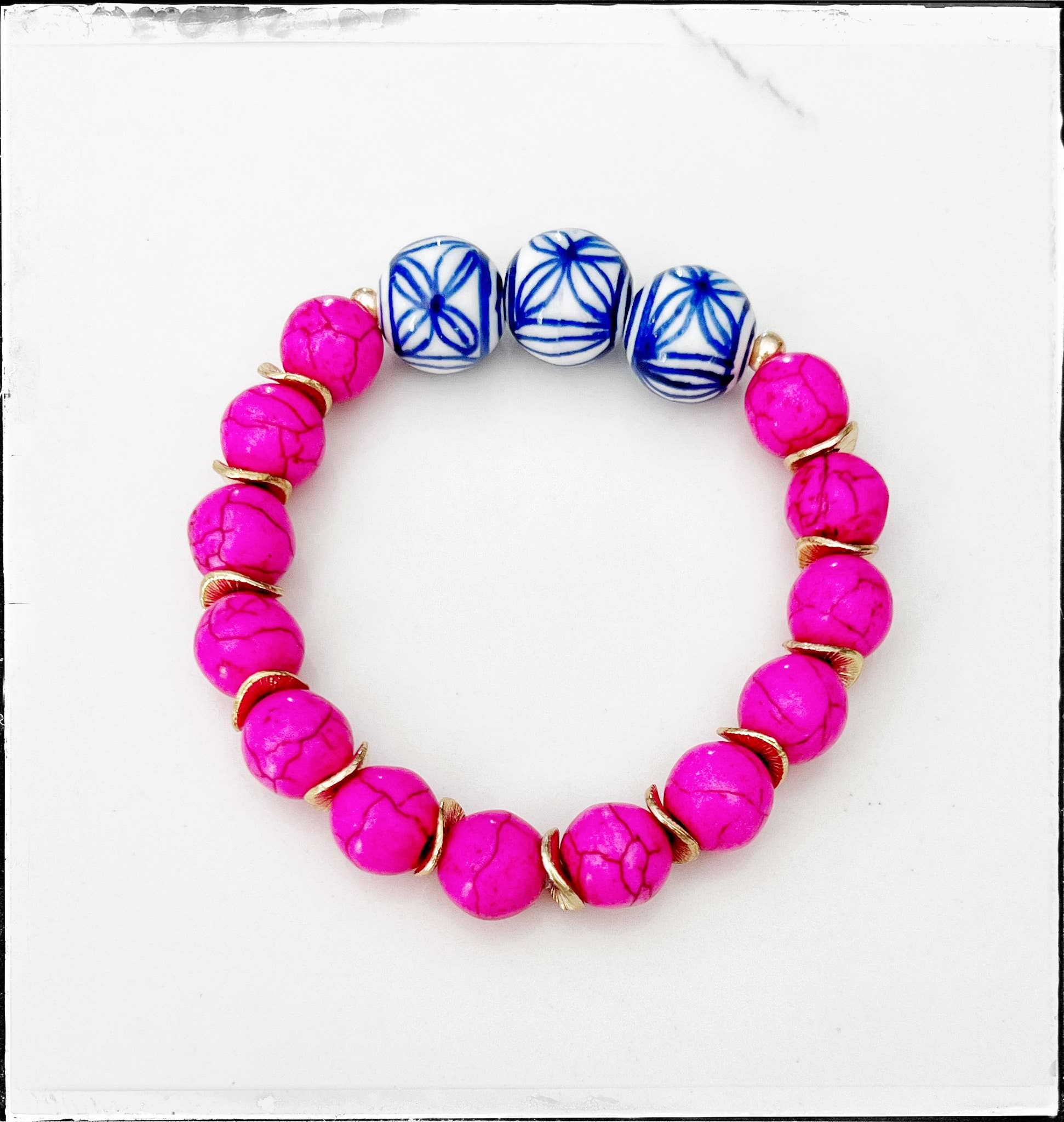 This handmade stacking stretch bead bracelet features a combination of Howlite gemstone dyed magnesite turquoise beads, fuchsia pink round beads, and hand-painted Chinoiserie ceramic beads, complemented by brass wavy textured beads.