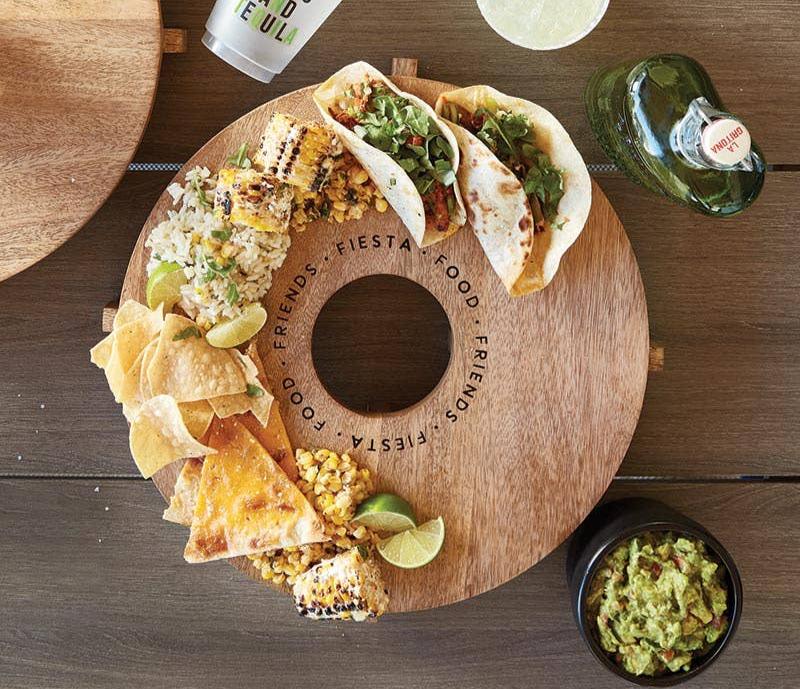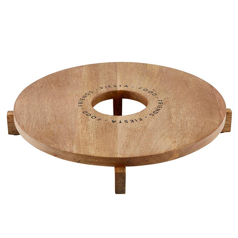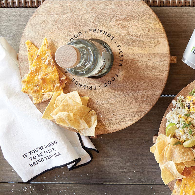 A unique spin on an average board! •Center opening fits a tequila bottle, wine bottle or your favorite store-bought dip in the center •Fun phrase, "Fiesta. Food. Friends", written around center opening.