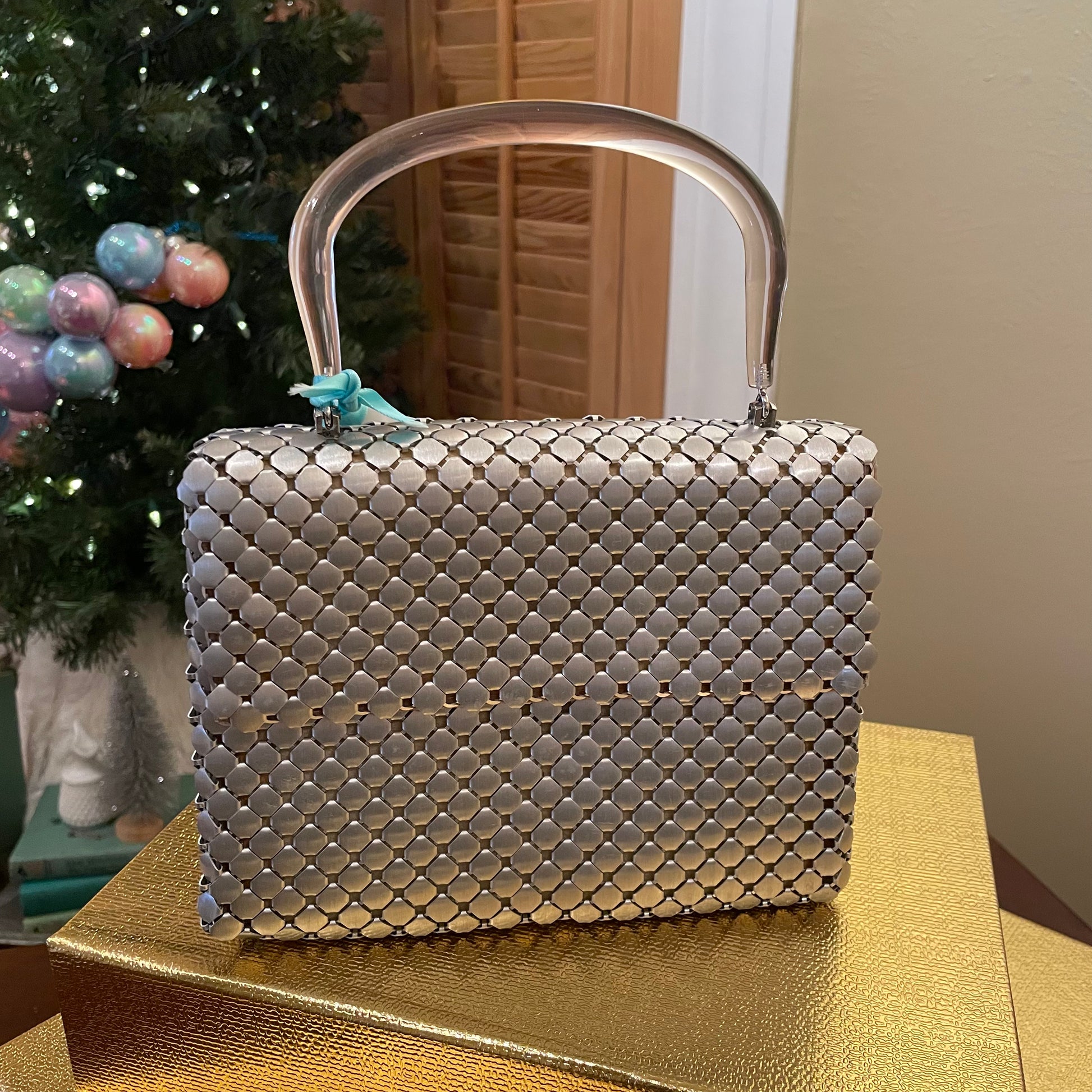 This vintage 1960s Whiting & Davis silver purse, complete with a stunning clear acrylic handle, is the perfect accessory for your modern-day glam.