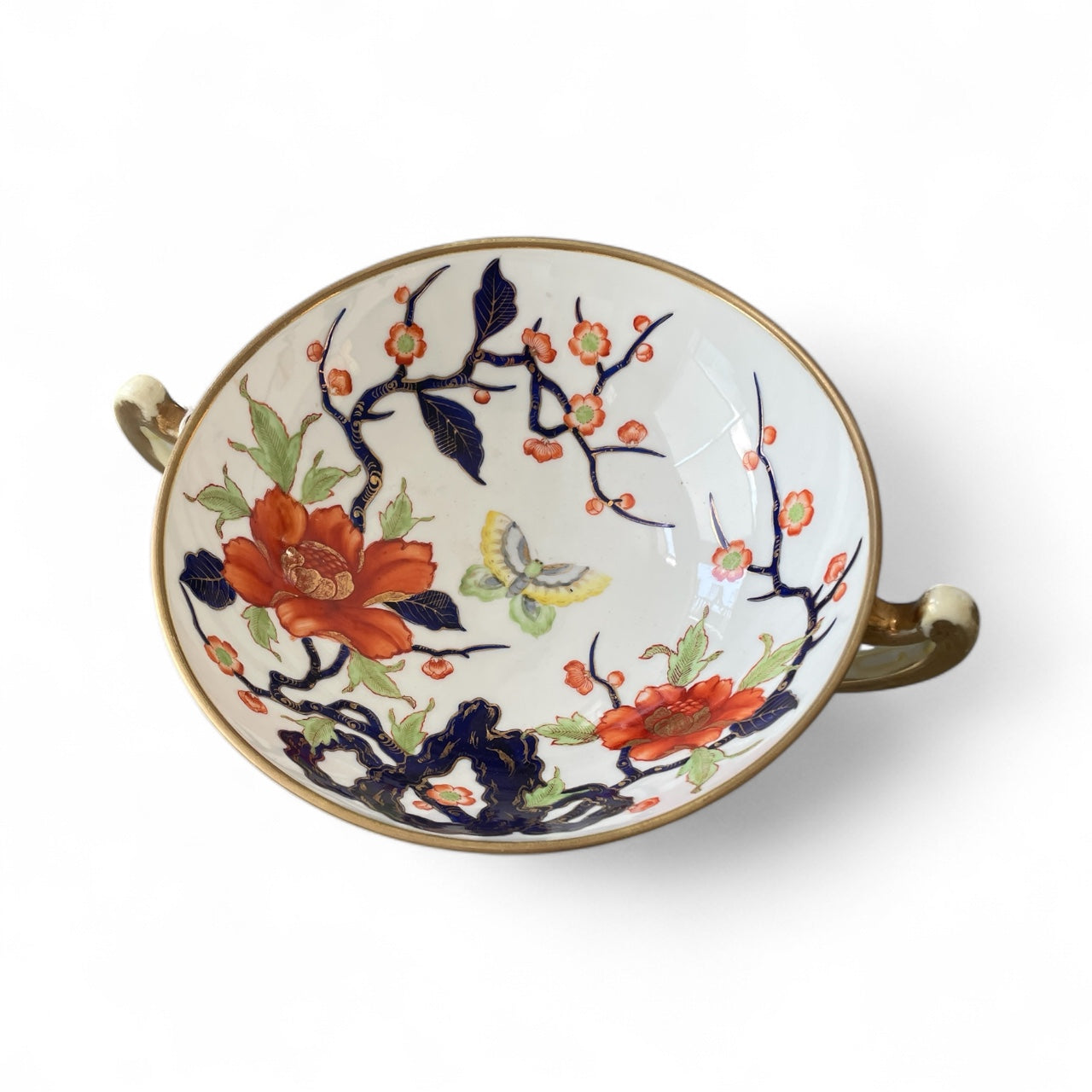 This vintage Noritake double-handled soup bowl is a little piece of everyday elegance from the 1940s–50s. Hand-painted with beautiful florals, rich cobalt blue, warm coral red, and shimmering gold trim, it’s the kind of dish that makes even a simple bowl feel special.